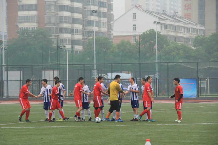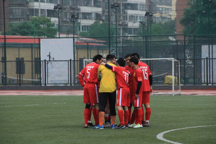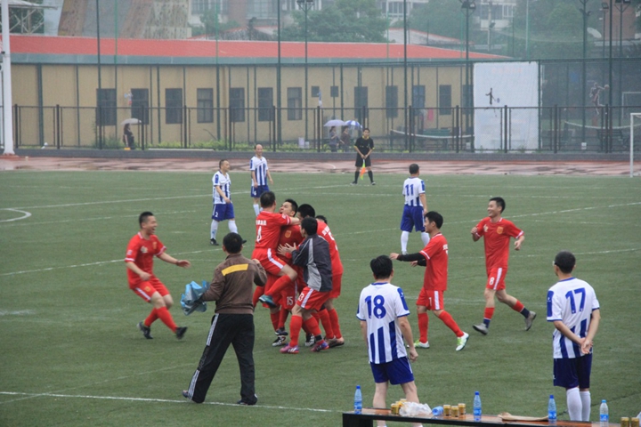 比賽開場不久,惡劣的天氣和球員的狀態(tài)不佳就讓我方遭到了懲罰,對方遠射,門將李釗不敢怠慢,奮力撲出第一點,無奈對方前鋒跟進補射得分。此后我方便開始奮力反撲,但始終不能攻破對手城池。第二節(jié),國貿(mào)聯(lián)隊的經(jīng)驗優(yōu)勢得以凸顯,他們站樁式的防守和不緊不慢的傳控,導致我方很長一段時間無法組織有效的進攻,加上我方隊員急躁的情緒,場面一度失控。休息時間全隊聚集討論,決定奮力一搏,隊長方波帶傷上陣,加強進攻。人員調(diào)整后,我方士氣明顯提升,經(jīng)過幾輪的組織,終于由徐學峰右路突破下底傳中,前點潘永博巧妙一漏,侯立峰左腳冷靜推射破門。一鼓作氣,方波角球精確助攻,對方中后衛(wèi)冒頂,侯立峰后點頭球再下一城。緊接著潘永博突破打門,對方門將脫手,方波跟進冒著左腿再次拉傷的危險,奮力將球打進,3:1鎖定勝局,全體隊員緊緊的擁抱在一起,場下啦啦隊也情緒高漲,擊鼓吶喊為安糧健兒加油。