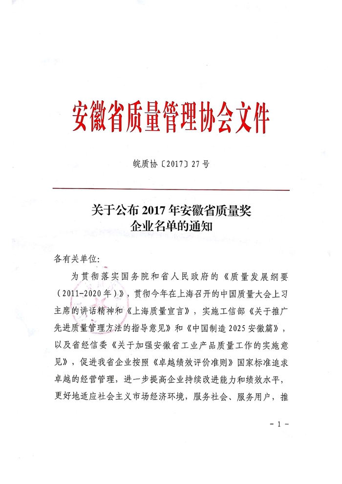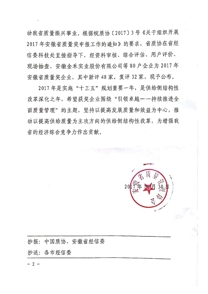 熱烈祝賀安糧實(shí)業(yè)榮獲“2017年度安徽省質(zhì)量獎(jiǎng)”