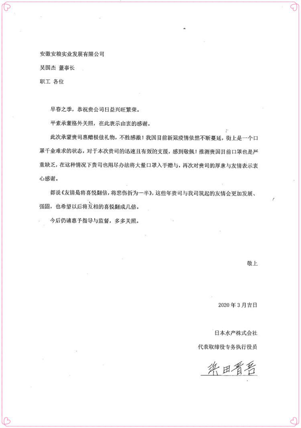 近日,日本水產(chǎn)株式會(huì)社的感謝信從東京寄到安糧實(shí)業(yè),用以表達(dá)對(duì)安糧實(shí)業(yè)捐助其10000只口罩的衷心感謝。