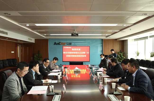 周洪副總裁對(duì)王局長(zhǎng)一行的到來表示歡迎,并介紹了公司的發(fā)展歷程、業(yè)務(wù)板塊及2020年經(jīng)營(yíng)情況。王局長(zhǎng)簡(jiǎn)要介紹了泰安市發(fā)展情況以及當(dāng)?shù)靥厣a(chǎn)品,提出希望發(fā)揮雙方平臺(tái)優(yōu)勢(shì),拓寬與安糧集團(tuán)的合作空間。雙方與會(huì)人員就農(nóng)產(chǎn)品研發(fā)、產(chǎn)業(yè)化建設(shè)及推動(dòng)當(dāng)?shù)赝庀蛐徒?jīng)濟(jì)發(fā)展等方面展開了深入的交流討論。