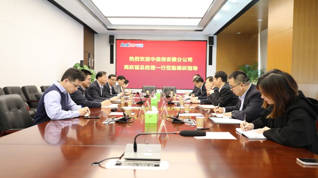 3月3日下午,中信保安徽分公司黨委書記、總經(jīng)理周躍斌帶隊來公司調(diào)研,曹訓(xùn)立董事長熱情接待了周躍斌總經(jīng)理一行并舉行調(diào)研座談,周洪、吳國杰、朱亮及相關(guān)部門負責(zé)人參加座談會。