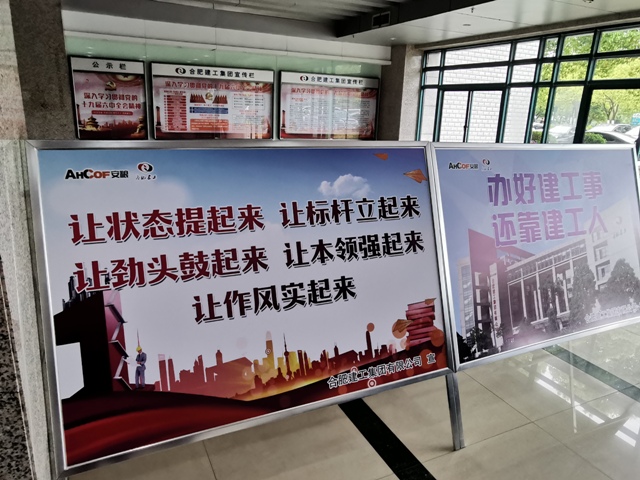 (一樓大廳立標(biāo)語(yǔ),建工人擼起袖子加油干)