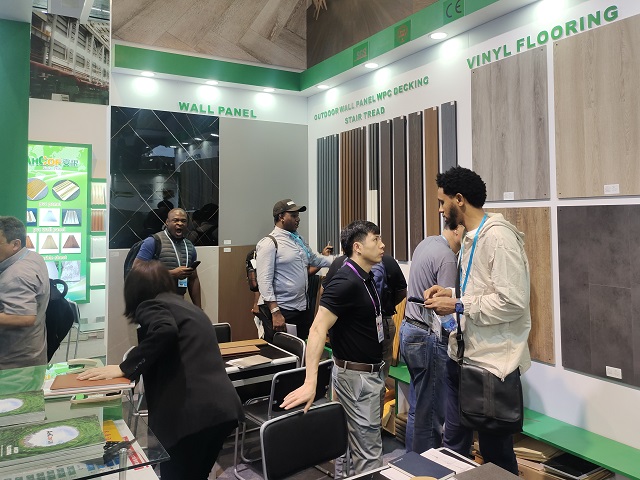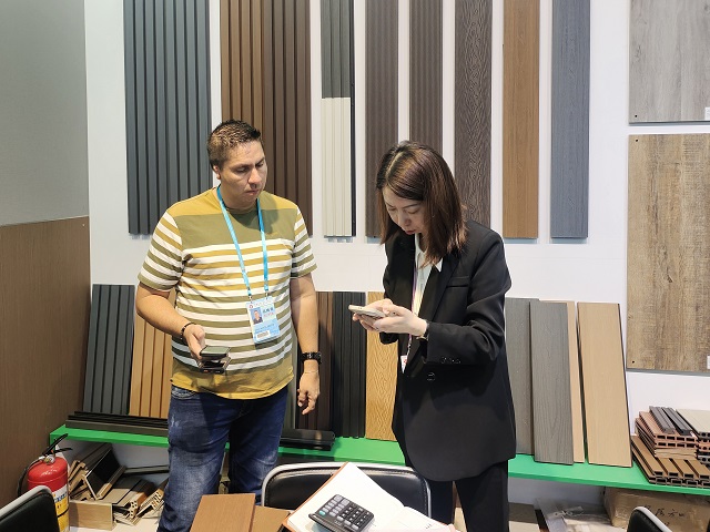 建材展位重點(diǎn)推出了墻板,格柵,樓梯踏板以及木塑戶(hù)外地板等新產(chǎn)品,從室內(nèi)到戶(hù)外產(chǎn)品一應(yīng)俱全。參展部門(mén)根據(jù)對(duì)去年秋季交易會(huì)的考察分析以及近期客戶(hù)最新詢(xún)盤(pán)情況的整合梳理,積極開(kāi)拓更新參展產(chǎn)品。結(jié)合國(guó)外最新流行的趨勢(shì),推出了拼花木紋,石紋等當(dāng)下十分暢銷(xiāo)的花色。利用立體燈箱,將產(chǎn)品優(yōu)勢(shì),產(chǎn)品結(jié)構(gòu)剖面等信息直觀展示,讓客戶(hù)更加清晰地了解產(chǎn)品的性能和優(yōu)點(diǎn),吸引諸多專(zhuān)業(yè)買(mǎi)家的觀看和洽談。此外,在攤位新增產(chǎn)品拼裝的體驗(yàn)區(qū),增加產(chǎn)品小樣及配件的DIY拼裝,吸引客戶(hù)自己動(dòng)手,大大提升了參與度和體驗(yàn)感,讓客戶(hù)真切地感受到安糧的誠(chéng)意與新意。