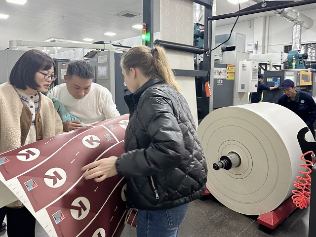 (業(yè)務(wù)員和客戶在紙杯印刷車間對紙杯印刷進行確認)