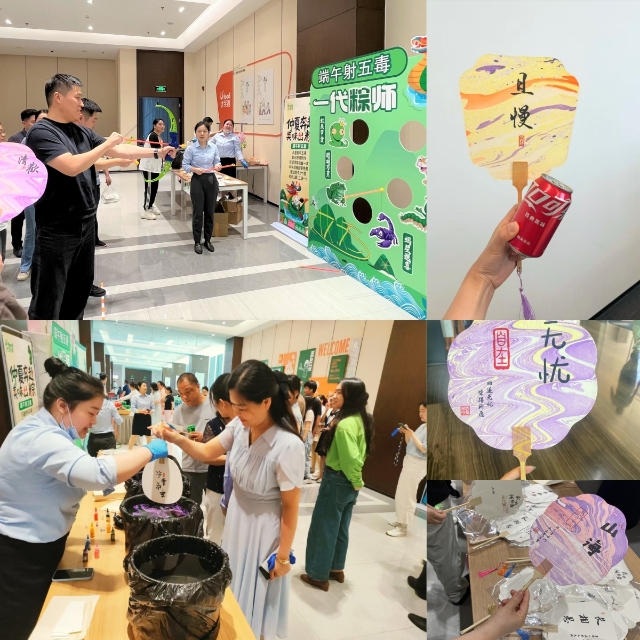 529,在公司餐廳開展的仲夏奔赴?美味出粽端午趣味活動(dòng),吸引眾多員工熱情參與?;顒?dòng)現(xiàn)場最具人氣的端午射五毒游戲,參與者手持弓箭瞄準(zhǔn)背景板上的蛇、蝎等五毒圖案,在體驗(yàn)傳統(tǒng)民俗競技樂趣的同時(shí),寄托驅(qū)邪避毒、祈福安康的心愿。同步開展的非遺漆扇制作活動(dòng)讓員工通過親手創(chuàng)作進(jìn)一步深化對非遺文化的認(rèn)知。成品扇子上,“山?!薄盁o憂”“且慢”等字樣與端午元素、傳統(tǒng)書法相映成趣